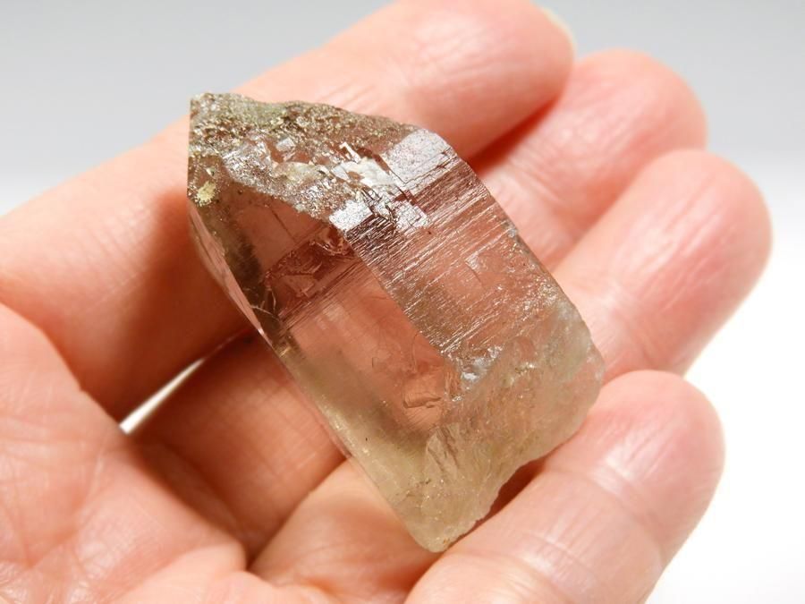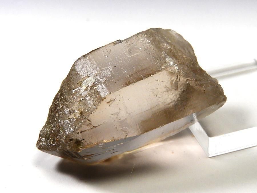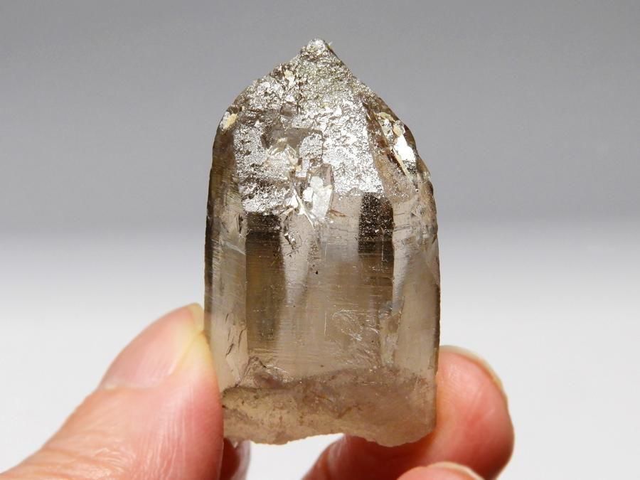 透明度の高いスモーキークォーツです。ファセットにはクローライトが付着し、細かな浸食跡で覆われています。淡いスモーキーカラーが透明感を引き立てています。