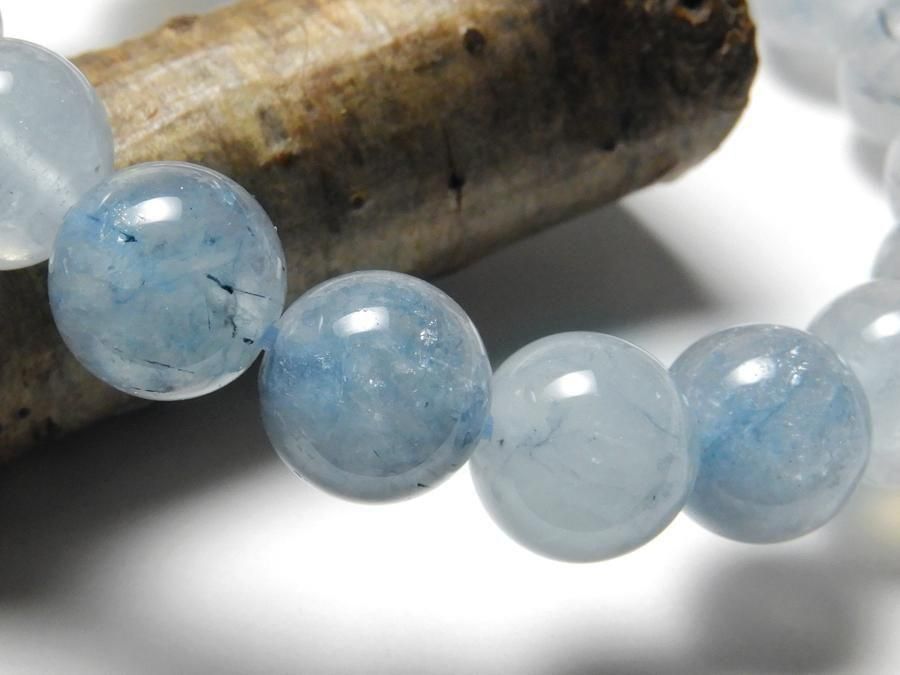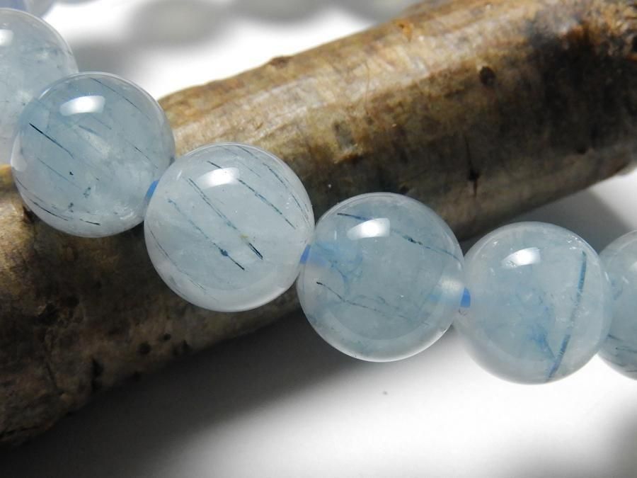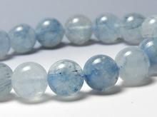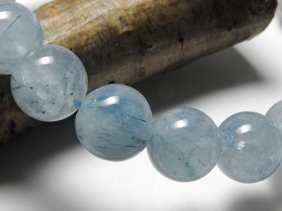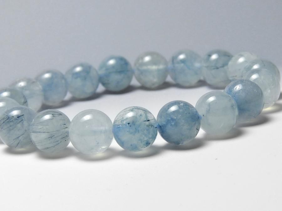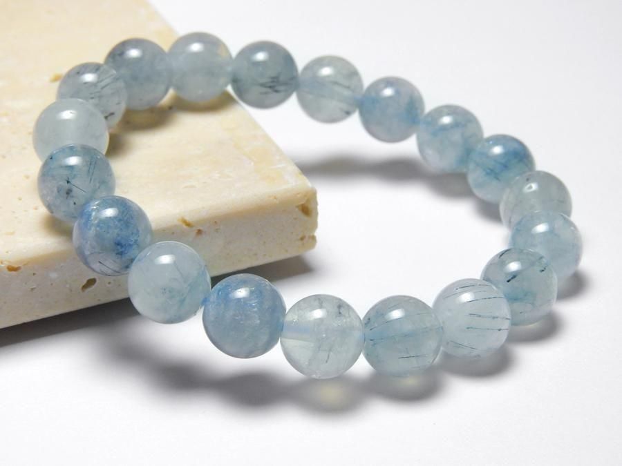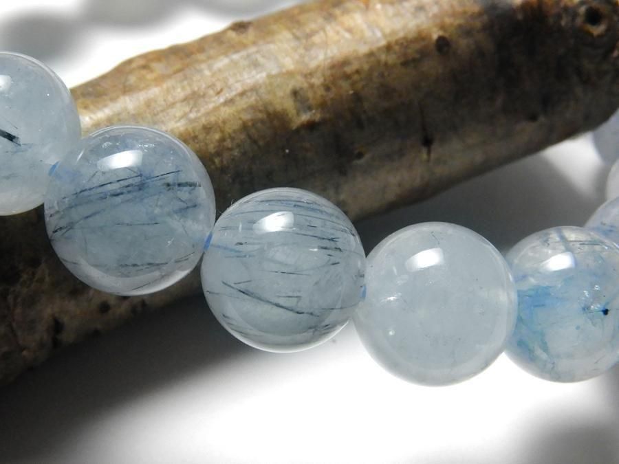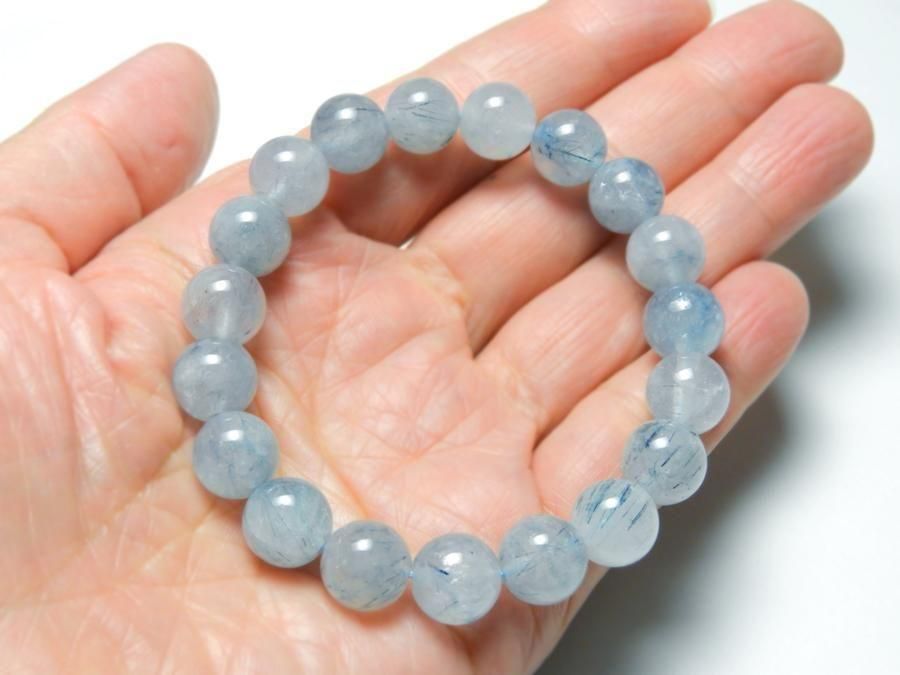 半透明の水晶です。グレイッシュな淡いブルーに色付いており、藍色の針状結晶が入っています。所々にオパレッセンスやシラー効果がみられます。ふんわりとした明るめの色合いのブレスレットです。