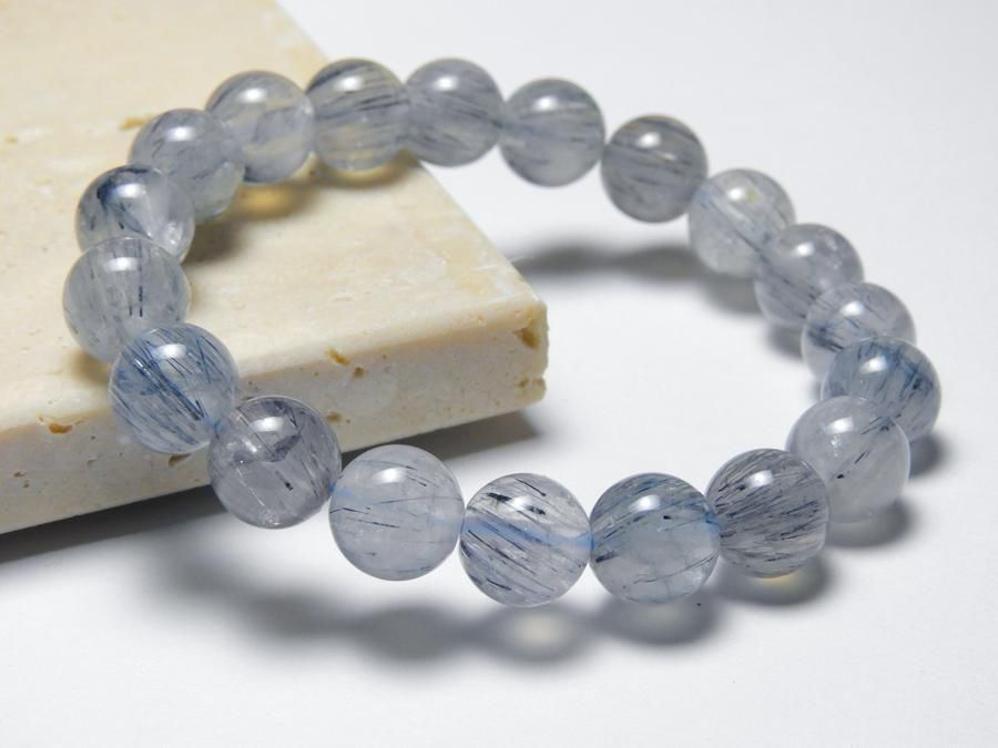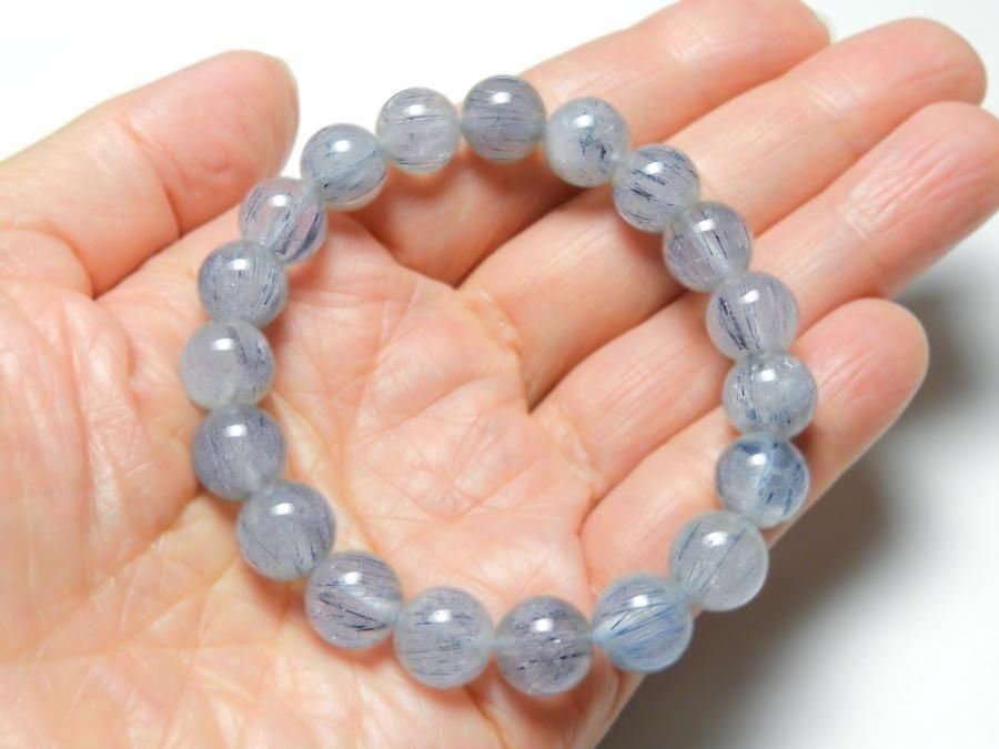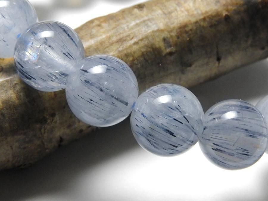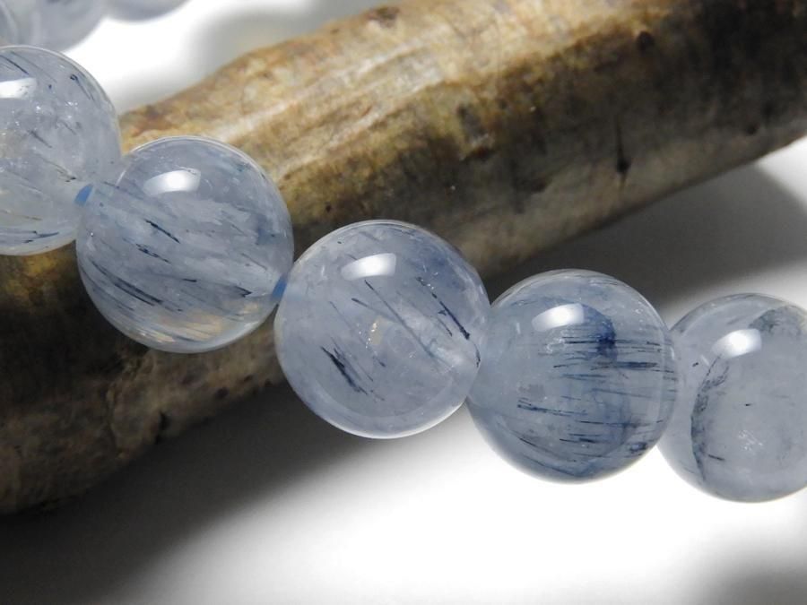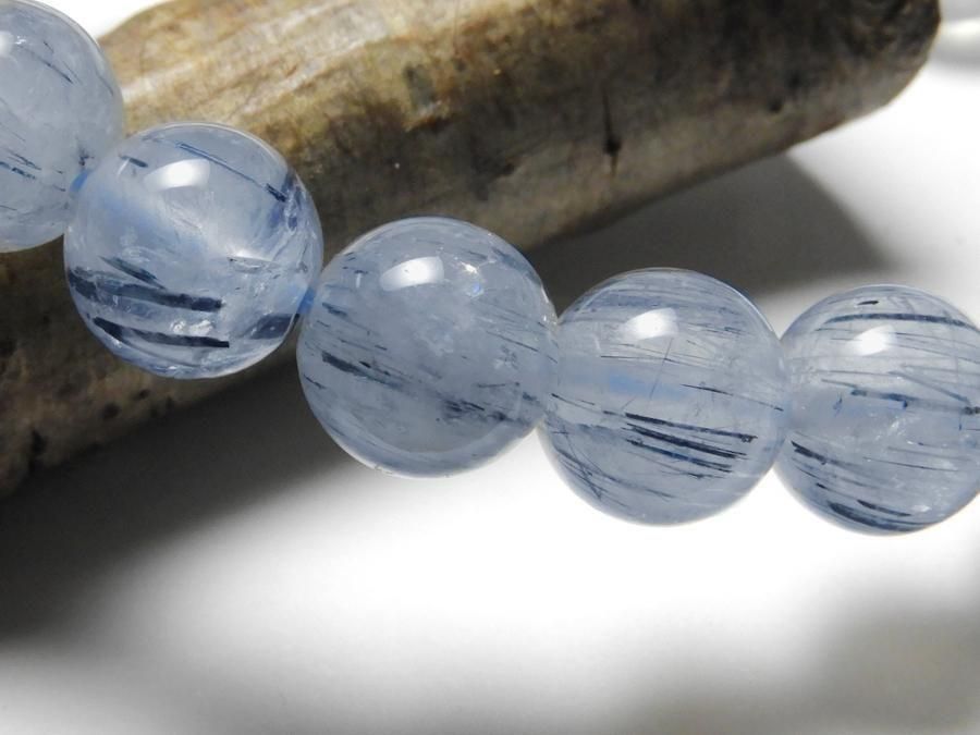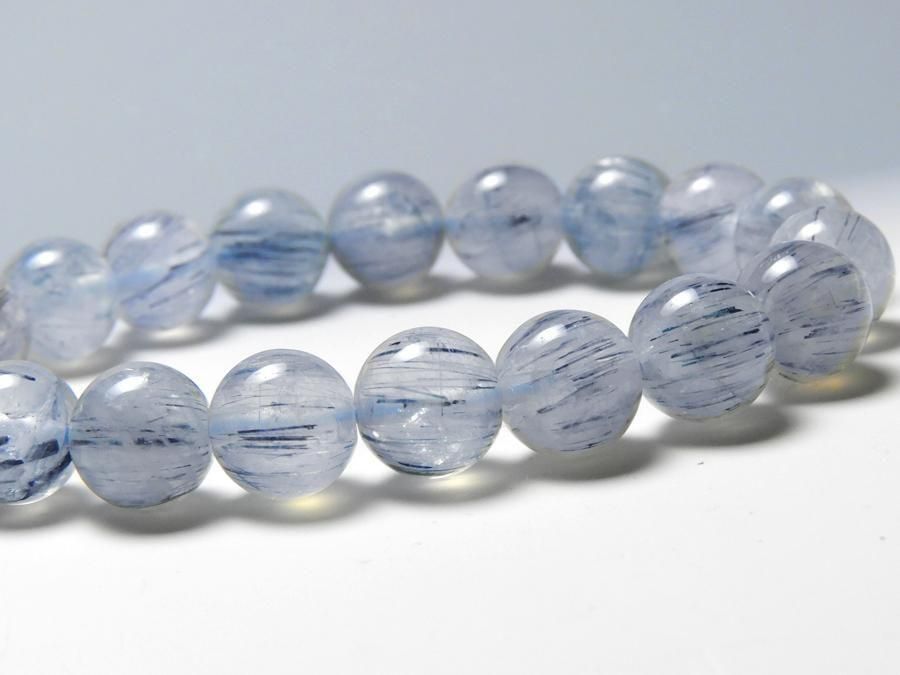 半透明の水晶です。グレイッシュな暗いブルーに色付いており、藍色の針状結晶が入っています。所々にオパレッセンスやシラー効果がみられます。