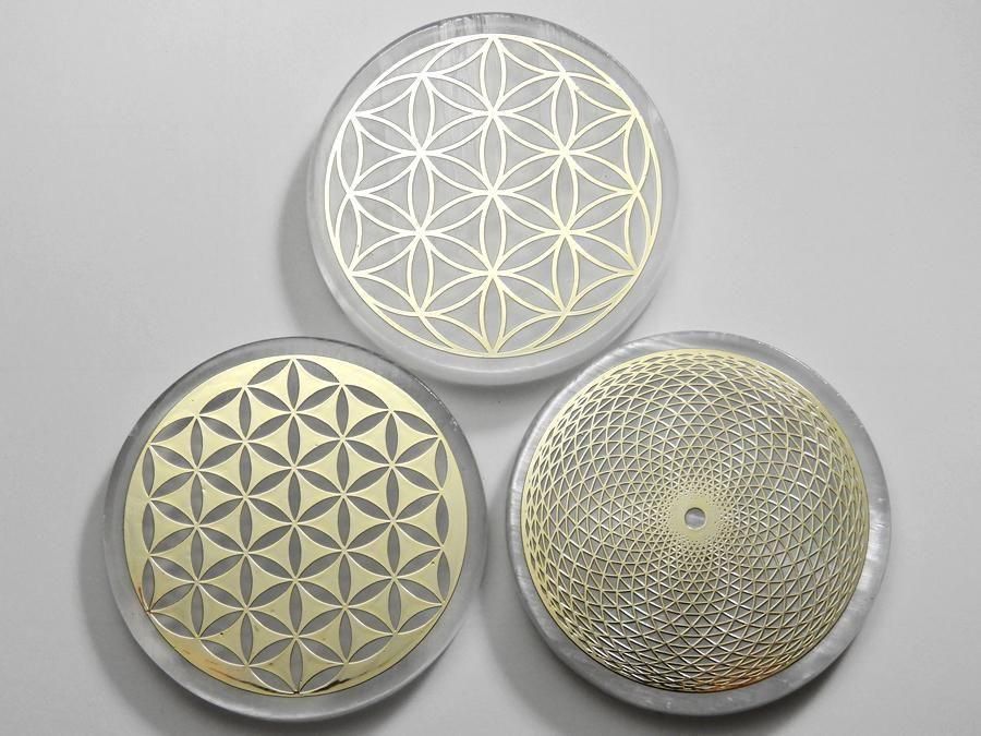 神聖幾何学エナジープレート|3種セット|セレナイト+フラワーオブライフ(ポジ、ネガ)、トーラス