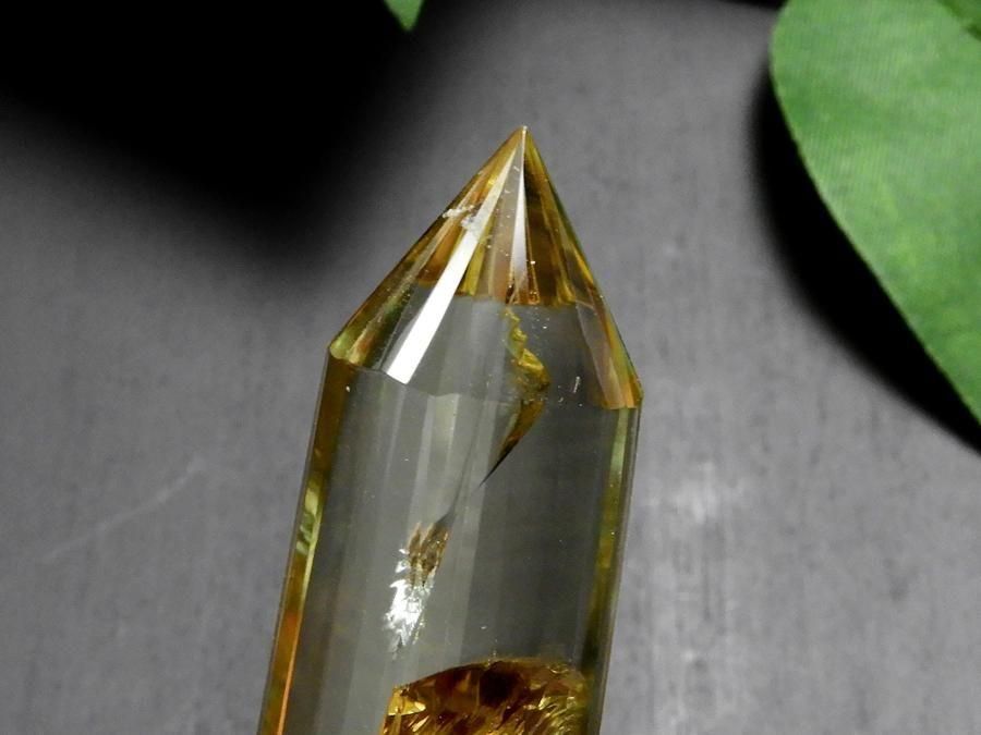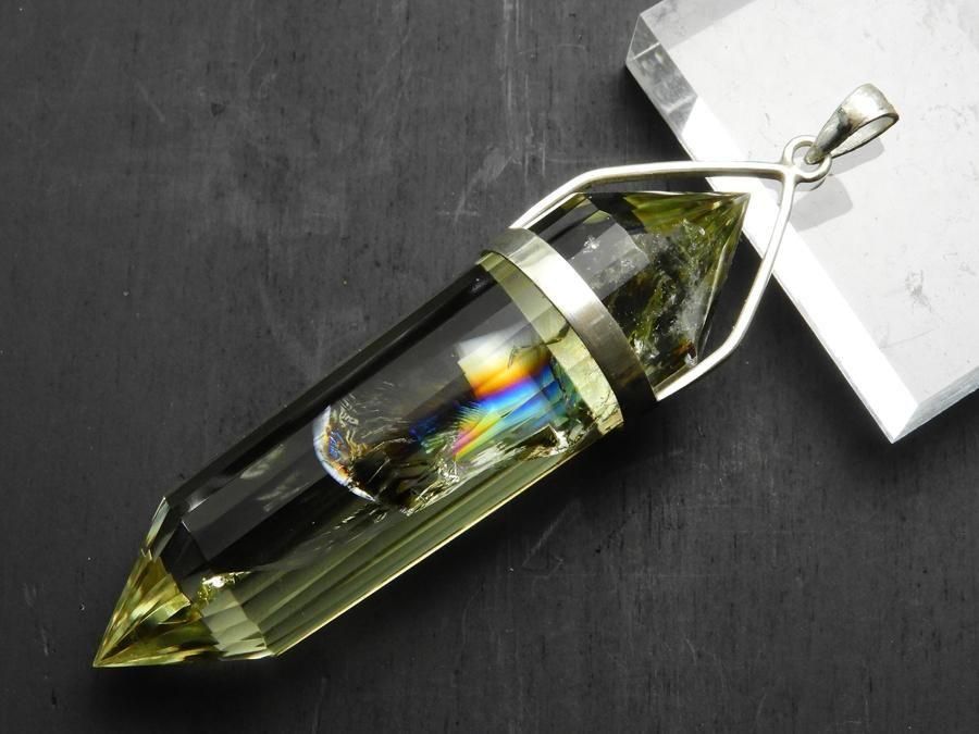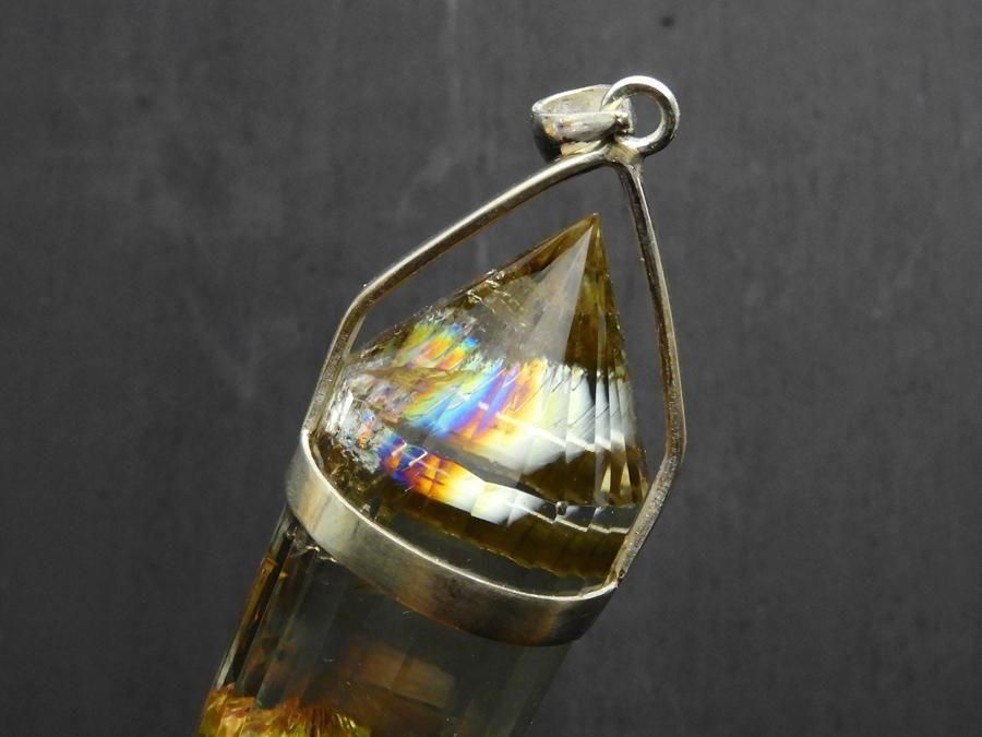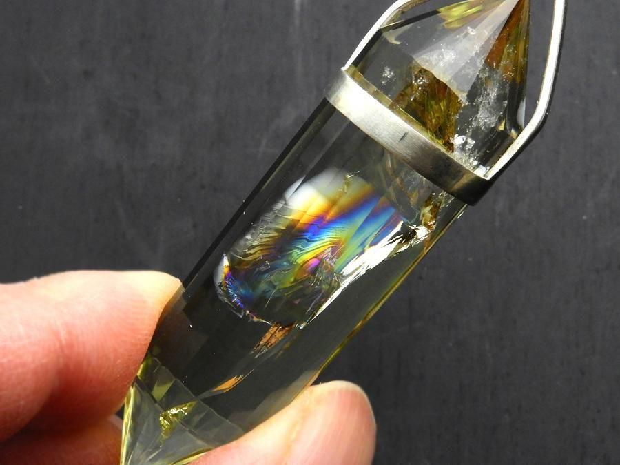 24角柱のヴォーゲルクリスタルです。柱面・錐面がそれぞれ24面にカットされており、合計72面となっています。透明度抜群の宝石質レインボーシトリンです。大きな虹がチャーミングです。レインボーはポジティブなエネルギーを生み出すため、ネガティブなエネルギーを寄せ付けないお守りになります。